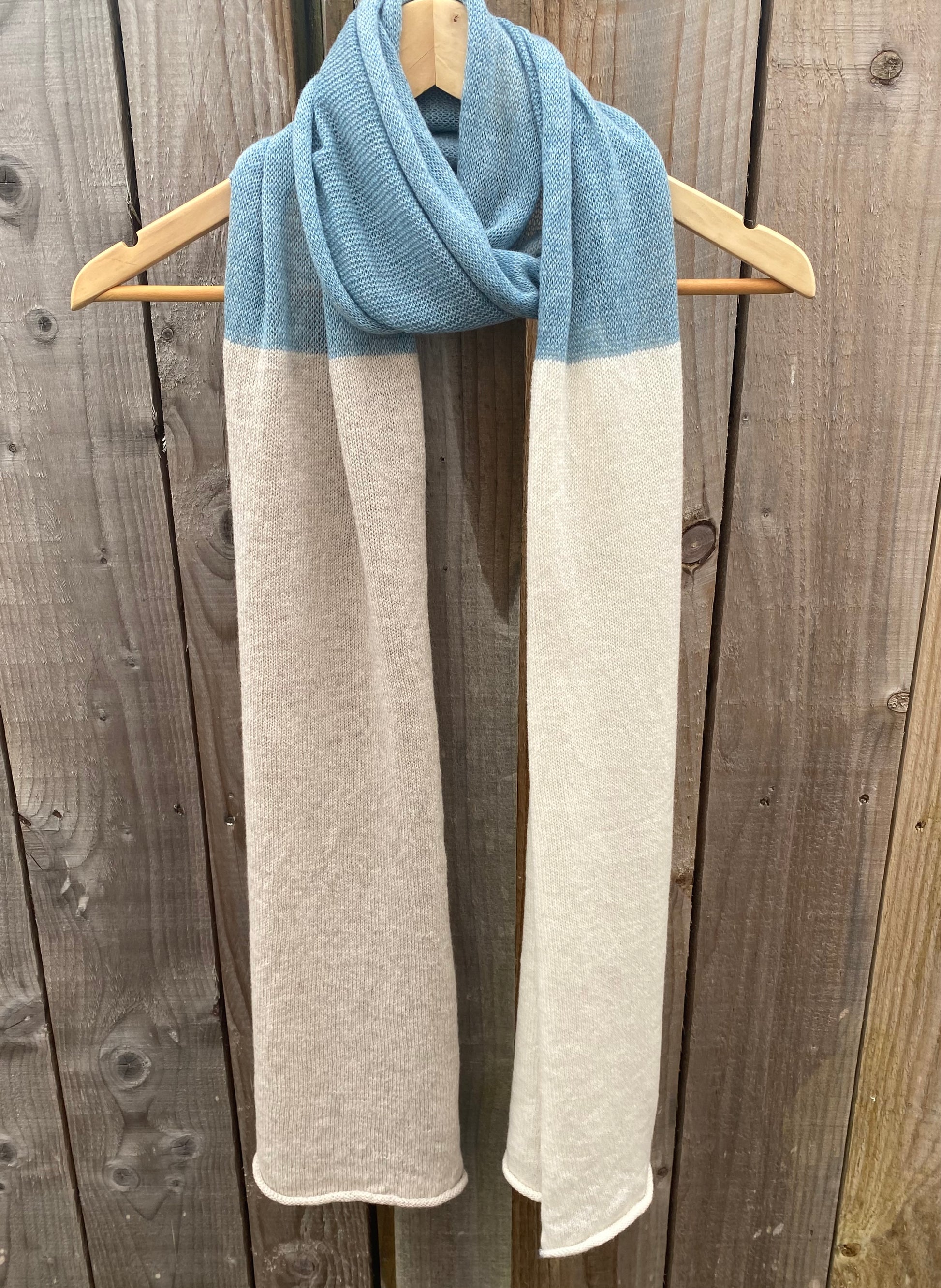 Elevate your winter style with this 70% lambswool and 30% Cashmere scarf, expertly handcrafted in Scotland. Featuring a bold block colour design, this scarf combines Beige and white lambswool length with a Blue Cashmere section that wraps comfortably around the neck. Lightweight yet warm, it’s perfect for adding a pop of color to cold-weather outfits while ensuring all-day coziness.